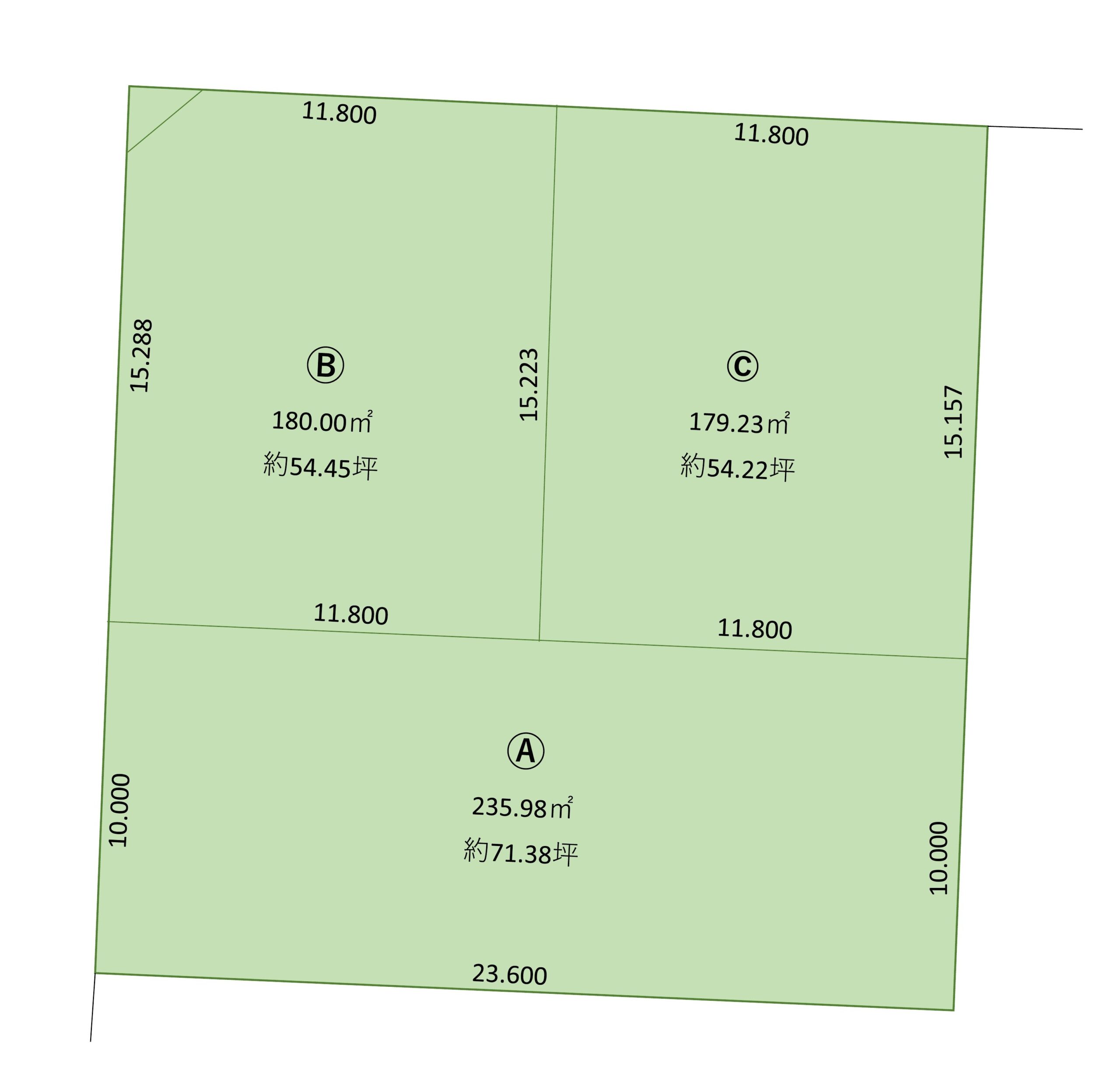 - 北側:幅員約4.44m、接道約22.8m 西側:幅員約6.15m、接道約24.6m