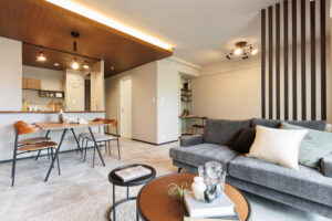 空間全体をグレートーンでまとめ、落ち着きと高級感を演出。
